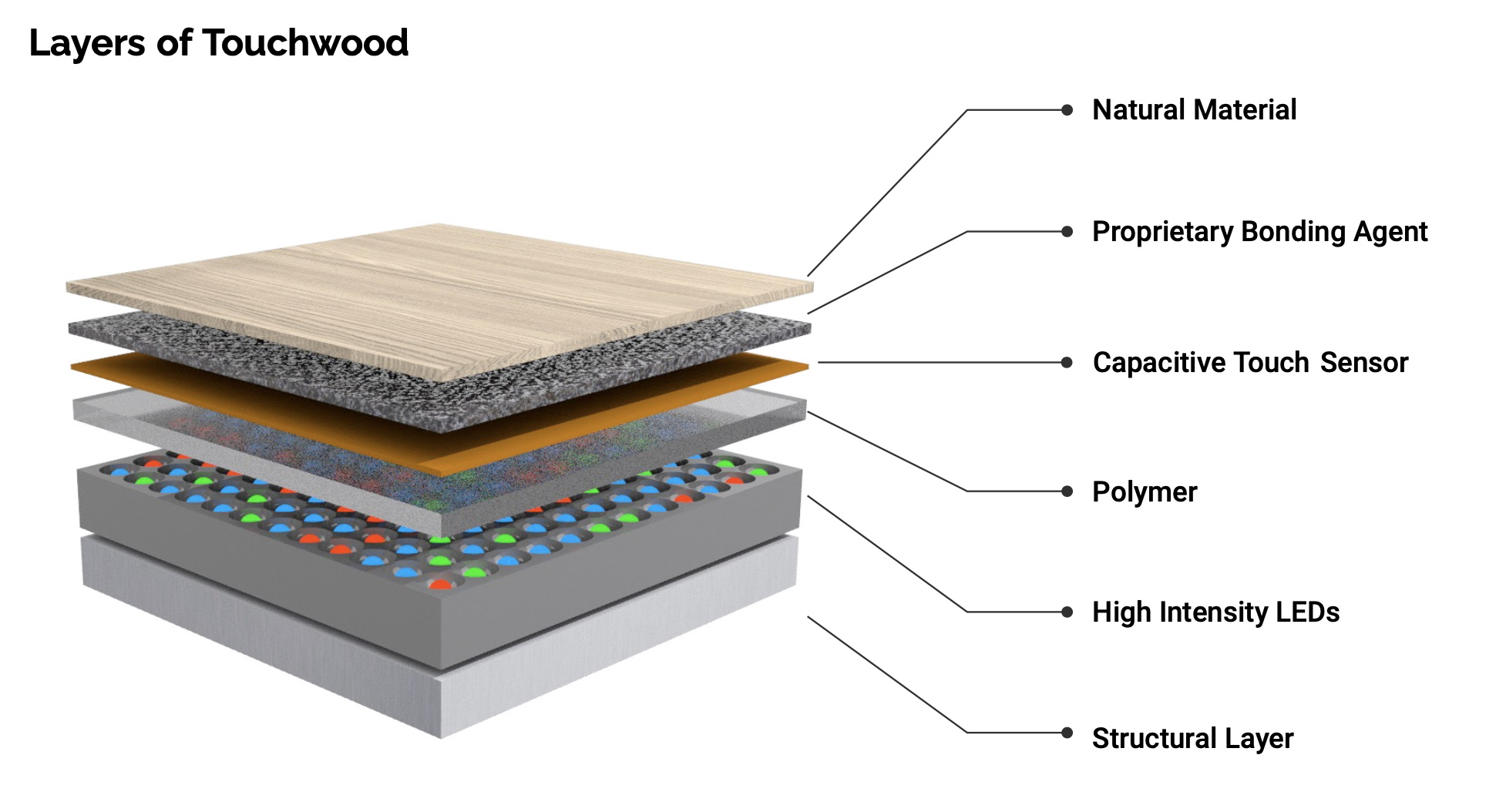 “What we’ve created is a modular tech platform that uses high-intensity LEDs with capacitive touch sensing. This allows us to embed it in essentially opaque material,” Dworman explained. “The wall, countertop, desk, in the home, the office, retail, transportation, we see so many ways to provide information and completely invisible controls.”