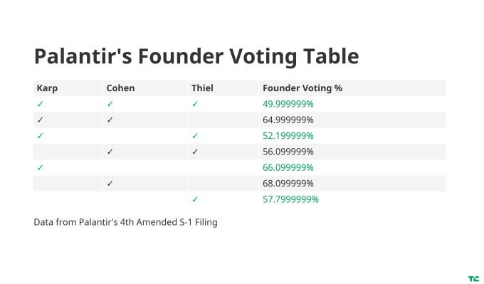 Today, the company provided a handy table on exactly what that all means, as it’s not simple at all. Let’s take a look at a cleaned-up version of their voting table, based on which founders are employed at Palantir at a specific time: