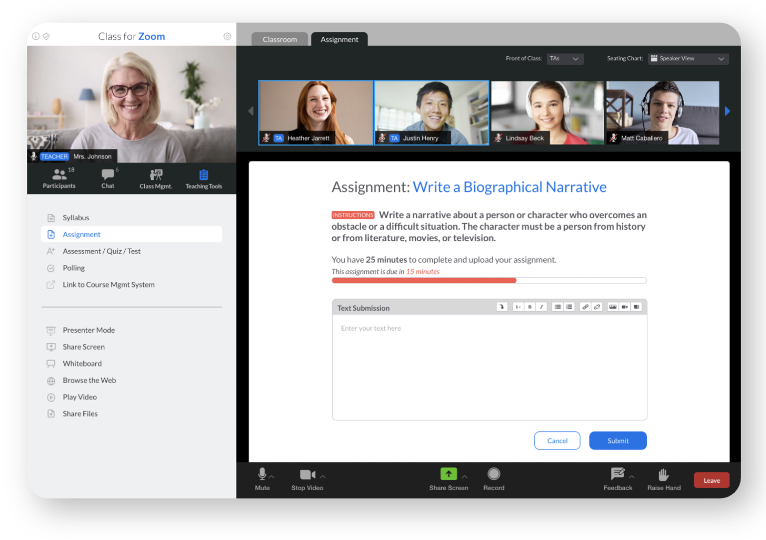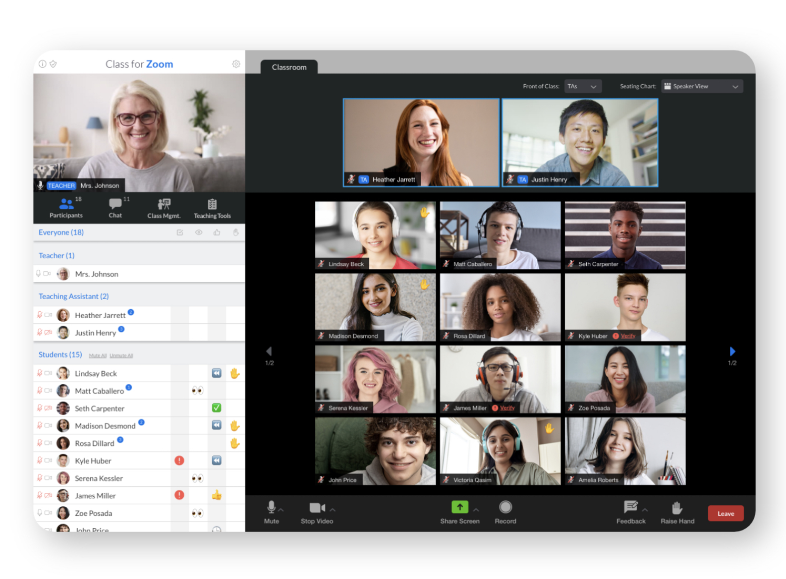 On the instruction side, Class for Zoom helps teachers launch live assignments, quizzes, and tests, which can be completed by students in real time. Students can also be polled to motivate engagement. Instructors can be granted access to unmute a class or mute a class during appropriate times.