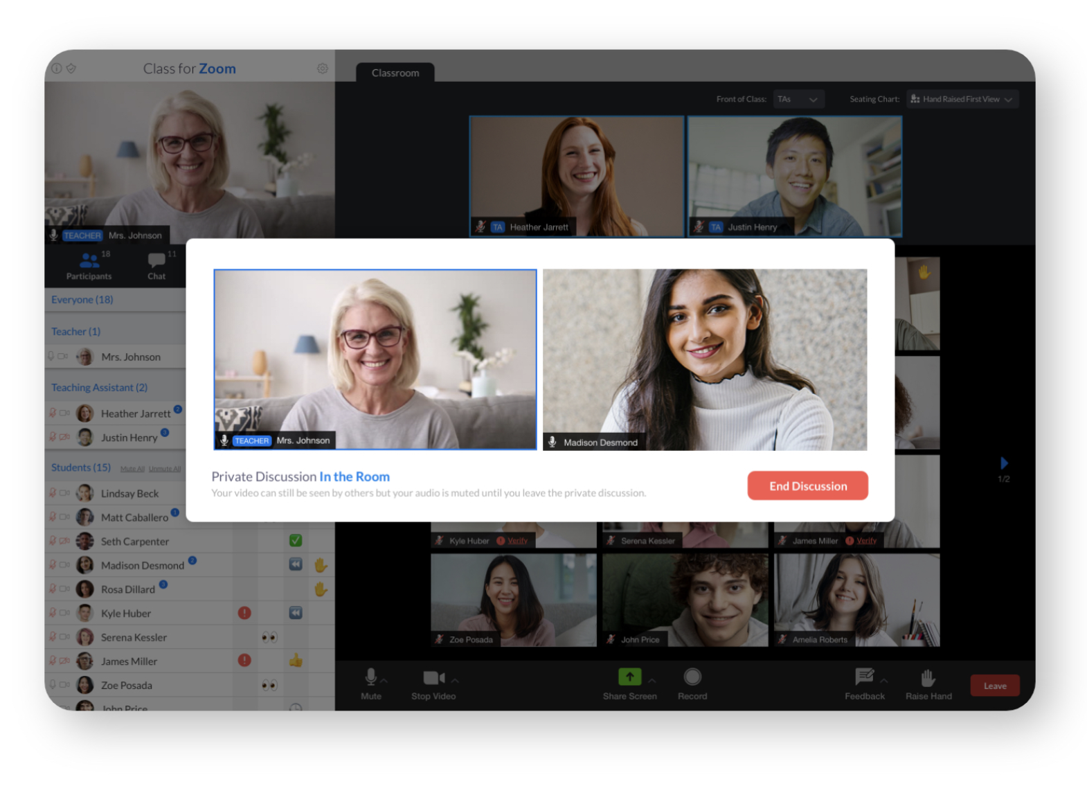 The marquee feature of the instruction tools is that teachers and students can talk privately without leaving the Zoom call if there’s a question. This is key for shy students who might not want to speak up, inspired by Chasen’s daughter, who struggled to share in front of an entire classroom.