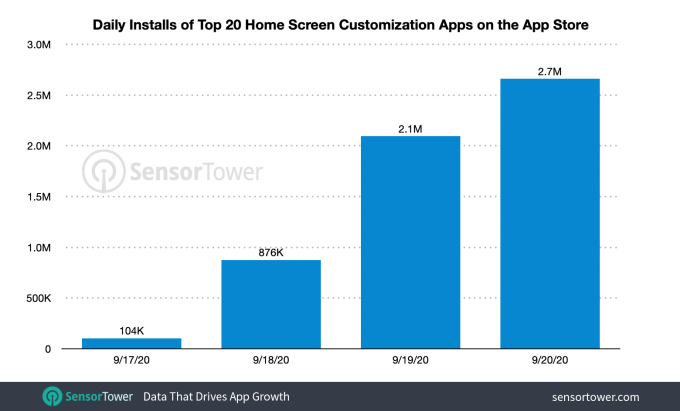 The iOS 14 home screen customization trend is driving a new set of apps to the top of the App Store charts, and delivering record downloads for sources of inspiration, like Pinterest. According to new data from app store market intelligence firm Sensor Tower, installs of the top 20 home screen customization apps reached 5.7 million total downloads worldwide in the first four days following the release of iOS 14 on September 16.