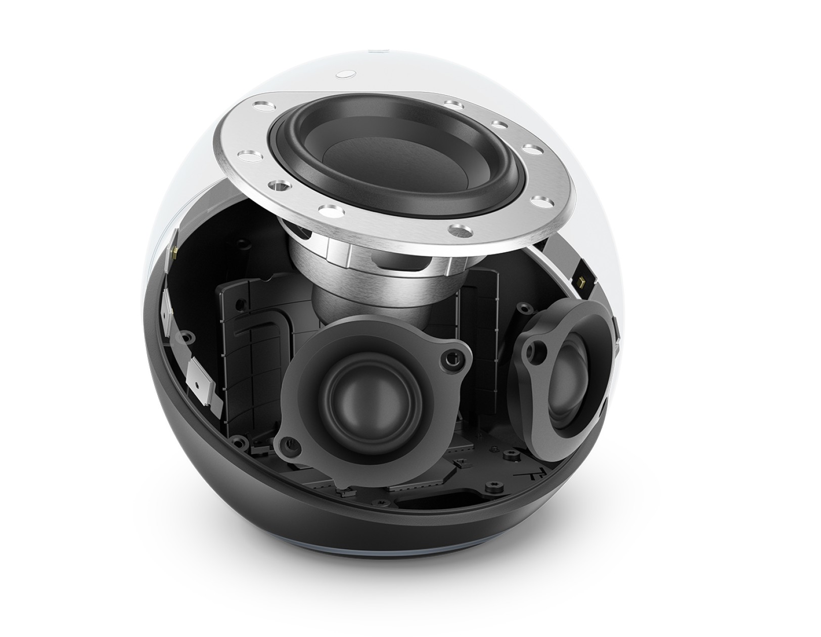 The blue light ring that lets you know the device is working has been moved to the bottom of the device, which appears to be a largely pragmatic choice, so as to not break up the all-over speaker design. The speaker ships in three colors at launch: Charcoal, Glacier White and Twilight Blue. It’s a subtle color scheme, not far removed from Google’s Nest/Home offerings.