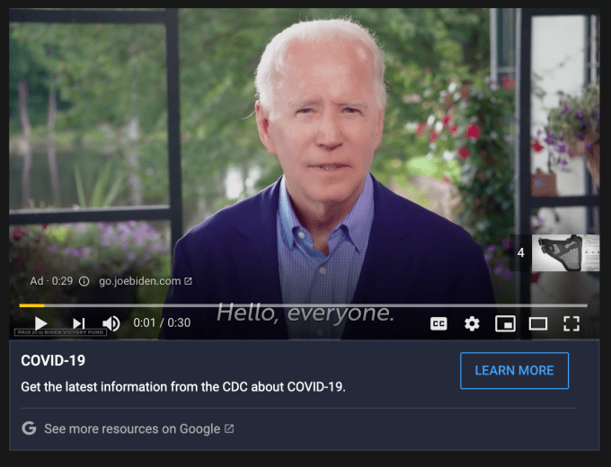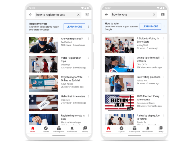 Like Snapchat, Twitter and Facebook, YouTube is also launching its own set of original informational election videos that will package facts on voting in the U.S. The YouTube videos take a playful approach, spoofing popular video trends like cooking tutorials. YouTube will also add reminders during “key moments” for the 2020 election, reminding users to register and telling them how and where to vote.