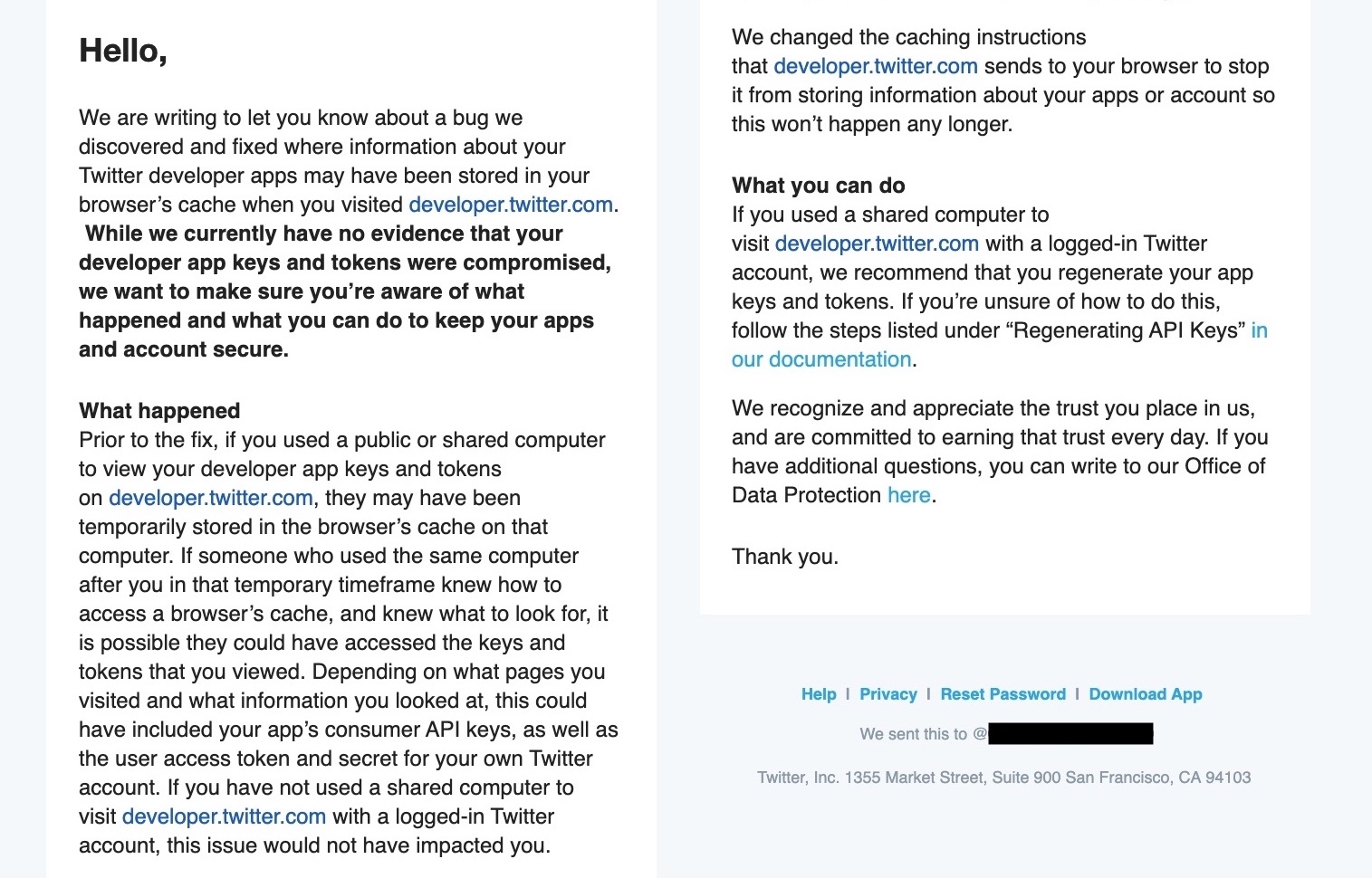 “Prior to the fix, if you used a public or shared computer to view your developer app keys and tokens on developer.twitter.com, they may have been temporarily stored in the browser’s cache on that computer,” the email read. “If someone who used the same computer after you in that temporary timeframe knew how to access a browser’s cache, and knew what to look for, it is possible they could have accessed the keys and tokens that you viewed.”