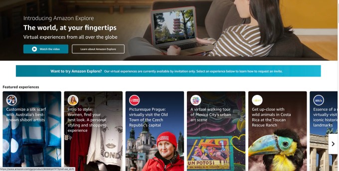 Amazon today is launching a new service called Amazon Explore that allows customers to book live, virtual experiences led by local experts. The experiences may be focused on creativity, learning DIY skills, taking virtual tours of far-off places or cultural landmarks or, in some cases, shopping local boutiques from around the world.