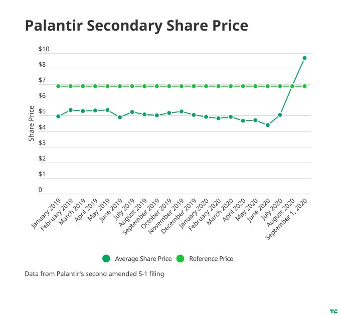 We looked at Palantir’s stock price over time based on internal trades, which have gone from around $5 a share at the beginning of January 2019 to $9.17 a share earlier this month as the company prepped its prospectus to go public. A reference price of $7.25 is below those last trades, and also below a $10 price point that The Wall Street Journal reported on last week from Palantir bankers.
