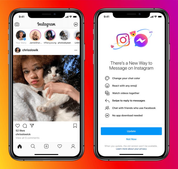 Facebook announced today it will begin rolling out new functionality that will allow Instagram and Messenger users to communicate across apps, in addition to bringing a host of Messenger-inspired features to the Instagram inbox. On Instagram, users will be presented with an option to update to a new messaging experience that offers the ability to change your chat color, react with any emoji, watch videos together, set messages to disappear and more. As a part of this update, they’ll also have the option to chat with friends who use Facebook, the app will inform them.