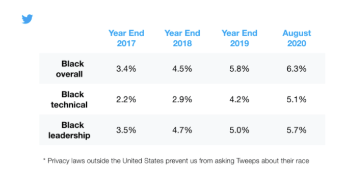 Twitter’s most recent diversity report showed that the company has done an okay job of increasing representation of Black employees at its company since 2017. In 2017, Twitter was just 3.4% Black and in August 2020, Twitter was 6.3% Black.
