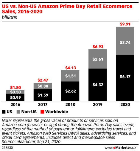 This is ahead of what Prime Day achieved in years past. In 2019, the sales event delivered $6.93 billion in sales, eMarketer says, with $4.32 billion from the U.S. Total Prime Day sales in 2016, 2017 and 2018 were at $1.5 billion, $2.47 billion and $4.13 billion, respectively.