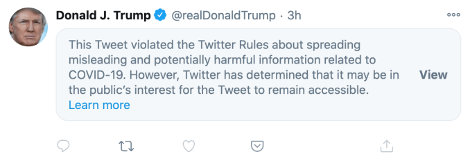 Facebook took down Trump’s post outright Tuesday, stating that it “[removes] incorrect information about the severity of COVID-19, and have now removed this post.” Twitter hid the tweet behind a warning saying that it broke the platform’s rules about spreading misleading or harmful COVID-19 misinformation.
