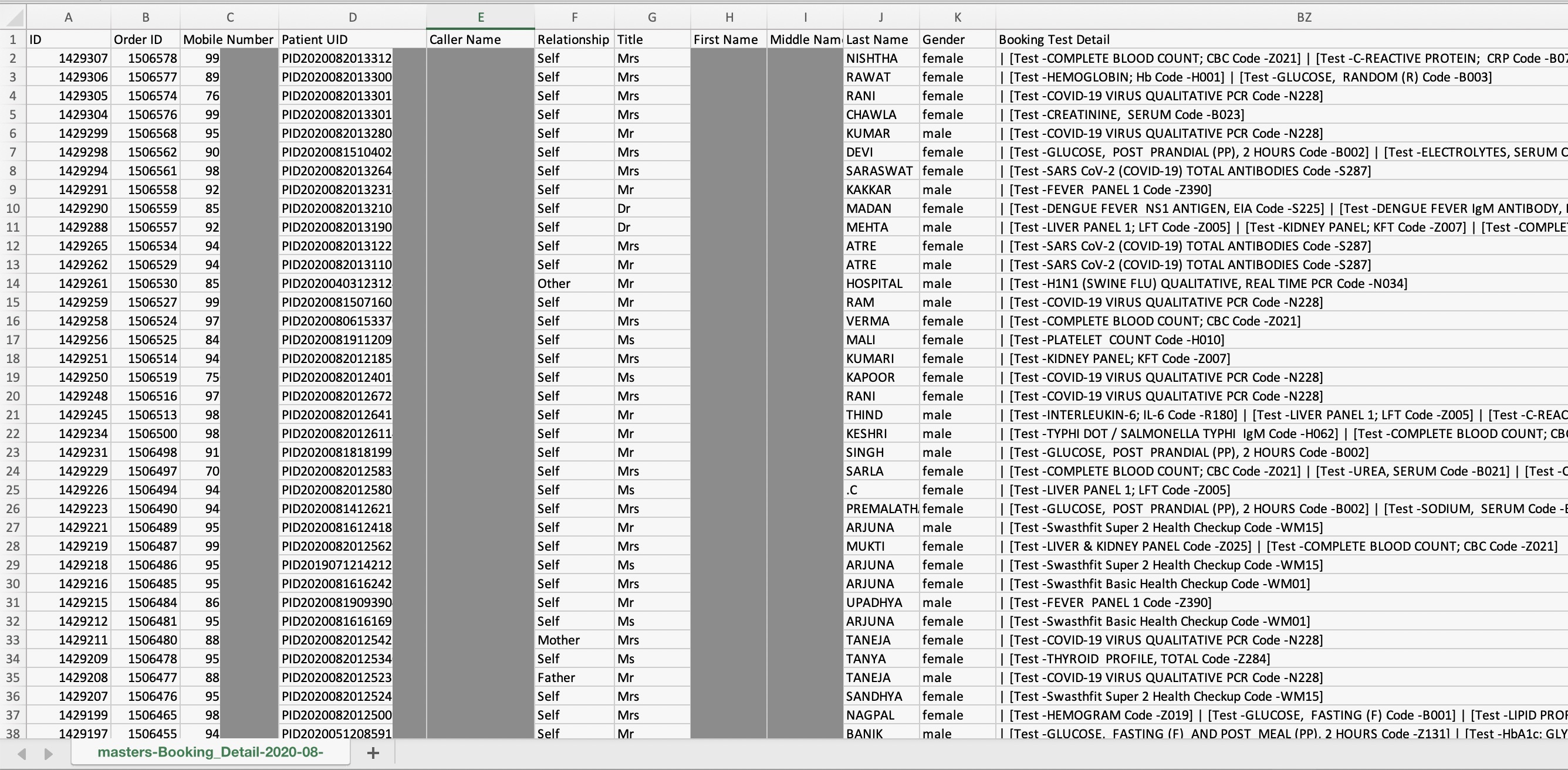 The spreadsheets appear to contain daily records of patient lab tests. Each spreadsheet contained a patient’s name, address, gender, date of birth and cell number, as well as details of the test that the patient is taking, which could indicate or infer a medical diagnosis or a health condition.