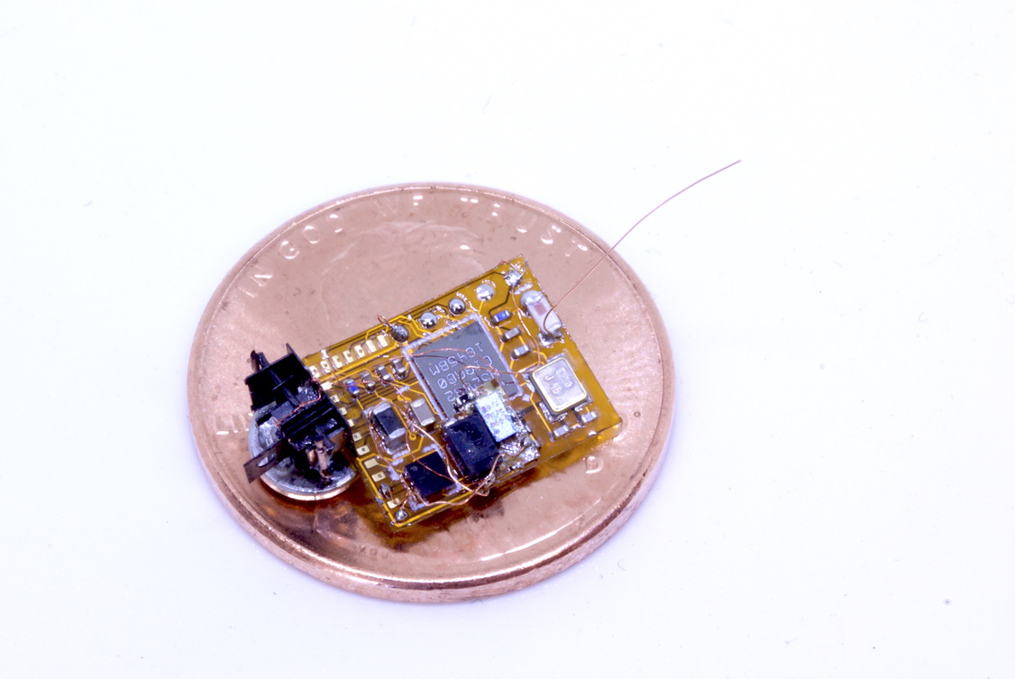 The sensor platform, which you can see below on top of a penny, could be anything from environmental monitoring to a microphone or light-sensing device. The battery could last for years on a power-sipping board like this, so it’s potentially a great match for long-term monitoring of hard-to-reach places.