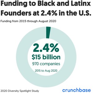 - In 2020, Black and Latinx founders have raised $2.3 billion, which represents 2.6% of all VC funding through August 31, 2020.