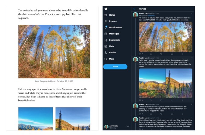 The new feature will allow you to tweet out every word of your post, as well as the accompanying images and videos, the company says. These will be automatically inserted into the thread where they belong alongside your text.