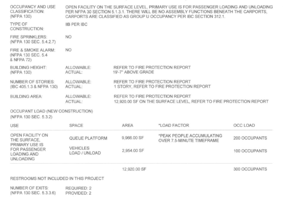 The above screenshot from the plans notes that the area where passengers get into and out of the Tesla cars has a peak occupancy load of 100 people every 7.5 minutes, equivalent to 800 passengers an hour. Even if the other stations had higher limits, this would limit the system’s hourly capacity to about 1,200 people.