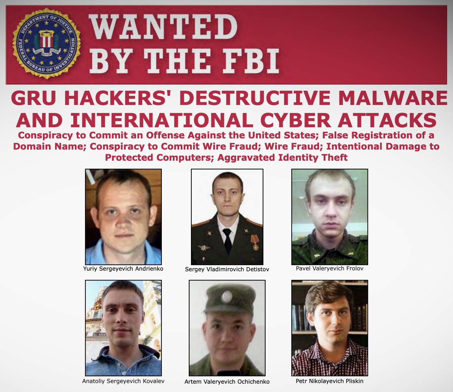 Prosecutors said the group of hackers, who work for the Russian GRU, are behind the “most disruptive and destructive series of computer attacks ever attributed to a single group.”