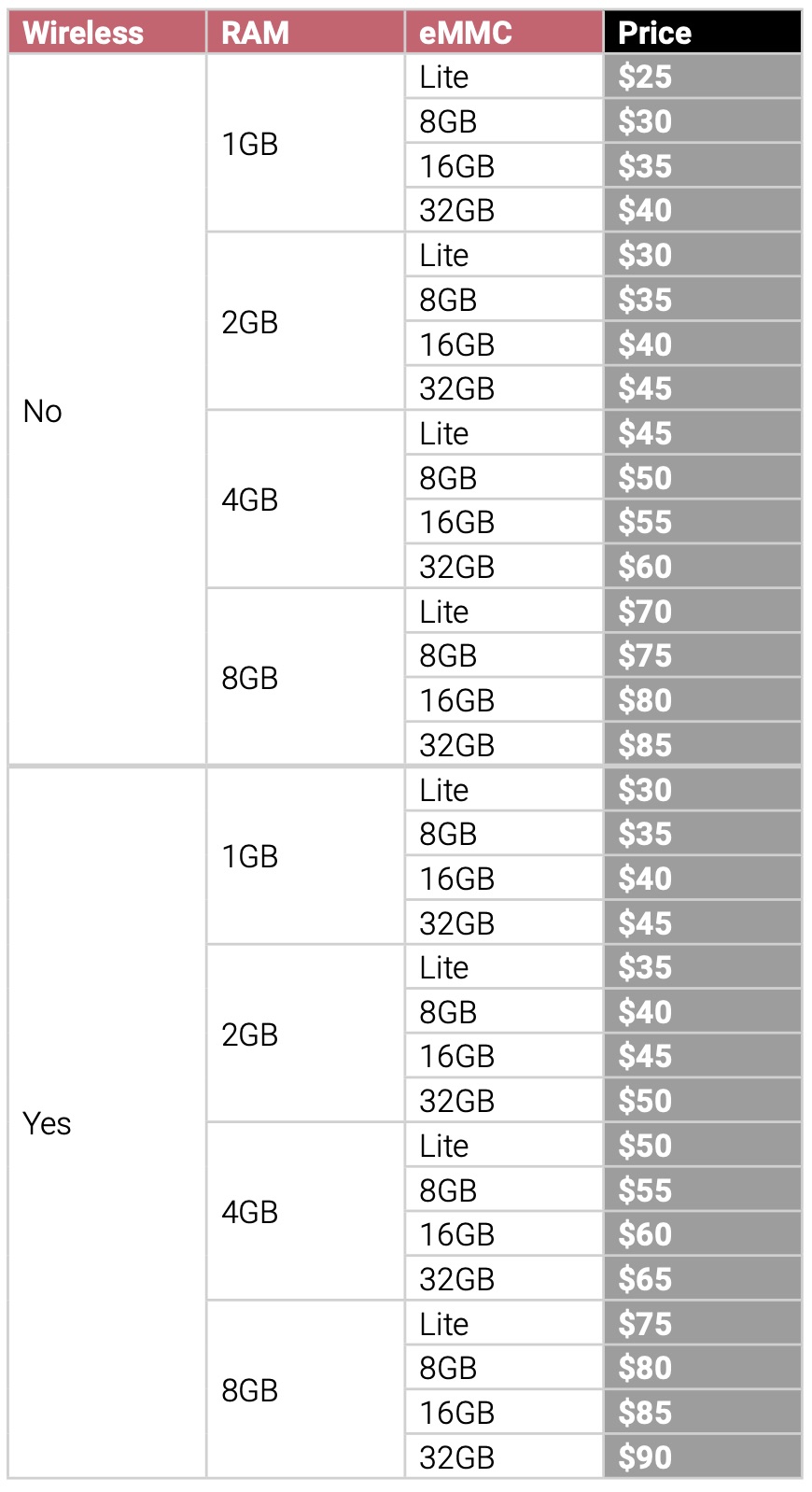 You can mix-and-match those specs to keep your costs down at scale. The result is that there are 32 different versions of the Compute Module 4 ranging from $25 (no wireless, 1GB of RAM, “Lite” eMMC) to $90 (wireless, 8GB of RAM, 32GB of eMMC).