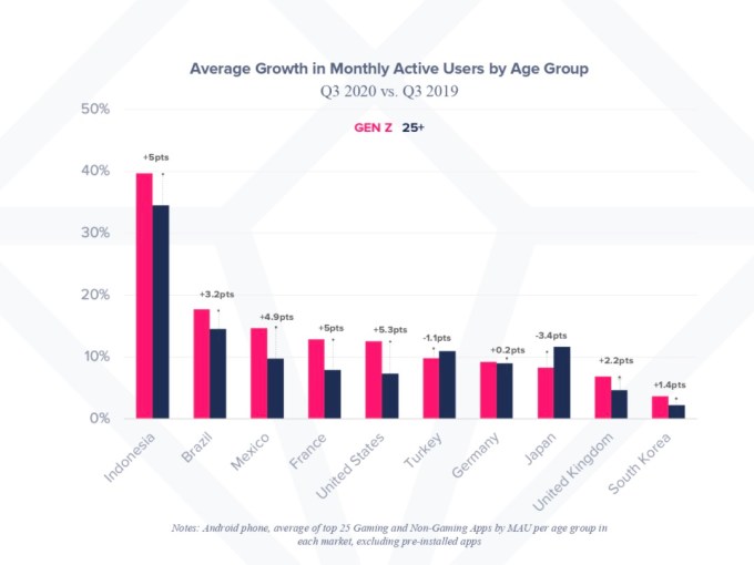 This app engagement data is only a view into Gen Z trends, but is an incomplete analysis, as it only focuses on select markets, including the U.S., U.K., Brazil, France, Germany, Indonesia, Japan, Mexico, South Korea and Turkey. It also included only data collected from Android devices, which doesn’t provide as full a picture.