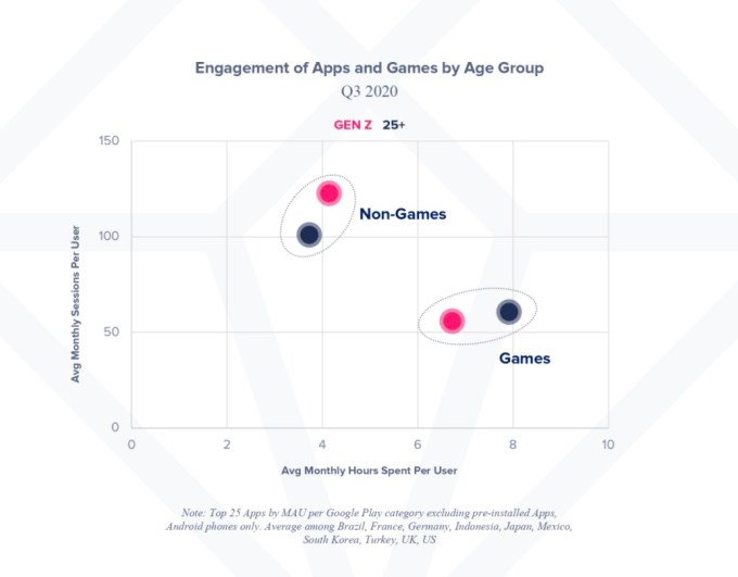 A new report released today by App Annie digs into how Gen Z consumers engage with their smartphones and mobile apps. According to data collected in Q3 2020, Gen Z users spend an average of 4.1+ hours per month in top non-gaming apps, or 10% longer than older demographics. They also engage with apps more often, with 20% more sessions per user in non-gaming apps, at 120 sessions per month per app, compared with older groups.