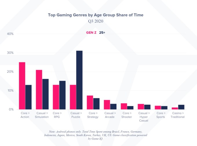App Annie found that Gen Z is more likely to use games than older users, but they don’t access them as often or use them as long. Those ages 25 and older actually spent nearly 20% longer in their most-used games and accessed them 10% more frequently. Both demographics spent more total time gaming than using non-game apps, on a monthly basis.