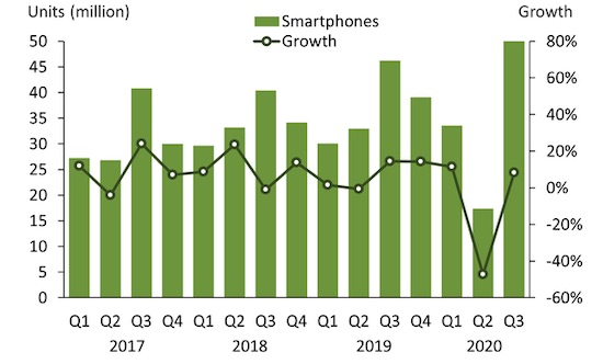According to a new report, about 50 million smartphones shipped in India in Q3 2020, a new quarterly record for the country where about 17.3 million smartphone units shipped in Q2 (during two-thirds of the period much of the country was under lockdown) and 33.5 million units shipped in Q1 this year, research firm Canalys said on Thursday.