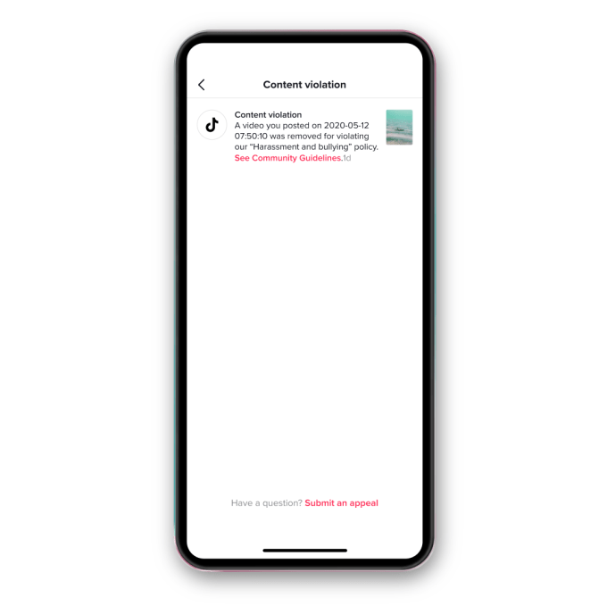 TikTok says it believes the new notification system for video removals will help to reduce repeat violations, as it did during tests. It also saw visits to its Community Guidelines nearly triple as a result of the new notifications, as well as a 14% reduction in requests for an appeal.