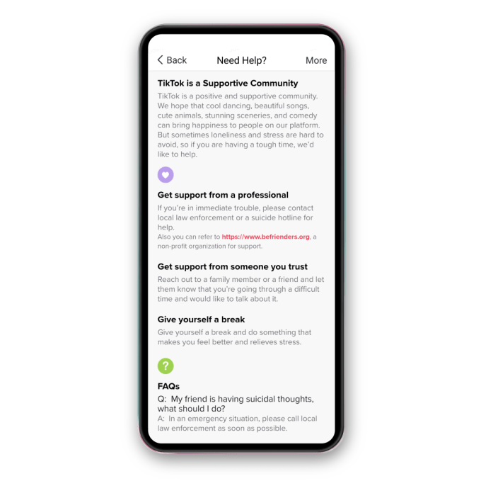 And if the video’s content was flagged as self-harm or suicide related, TikTok will also direct users to expert resources through an additional notification, including nonprofit befrienders.org. However, it doesn’t appear to include numbers for suicide hotlines, instead directing users or friends of users to call “local law enforcement.”