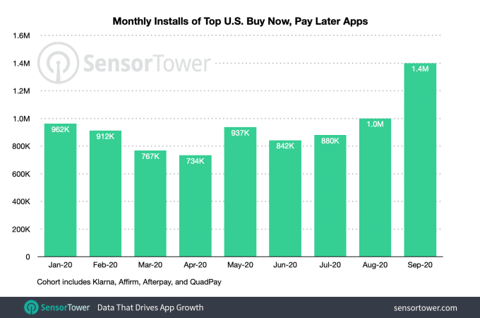 - Buy Now, Pay Later app usage in the U.S. up 186% year-over-year as of Sept. According to Sensor Tower, apps that let consumers make purchases on payment plans have been climbing steadily this year since the COVID-19 pandemic. The report looked at Klarna, Affirm, Afterpay and QuadPay, which together have generated 18 million lifetime installs across the App Store and Google Play. Installs were up 115% YoY in September, while monthly actives were up 186%.
