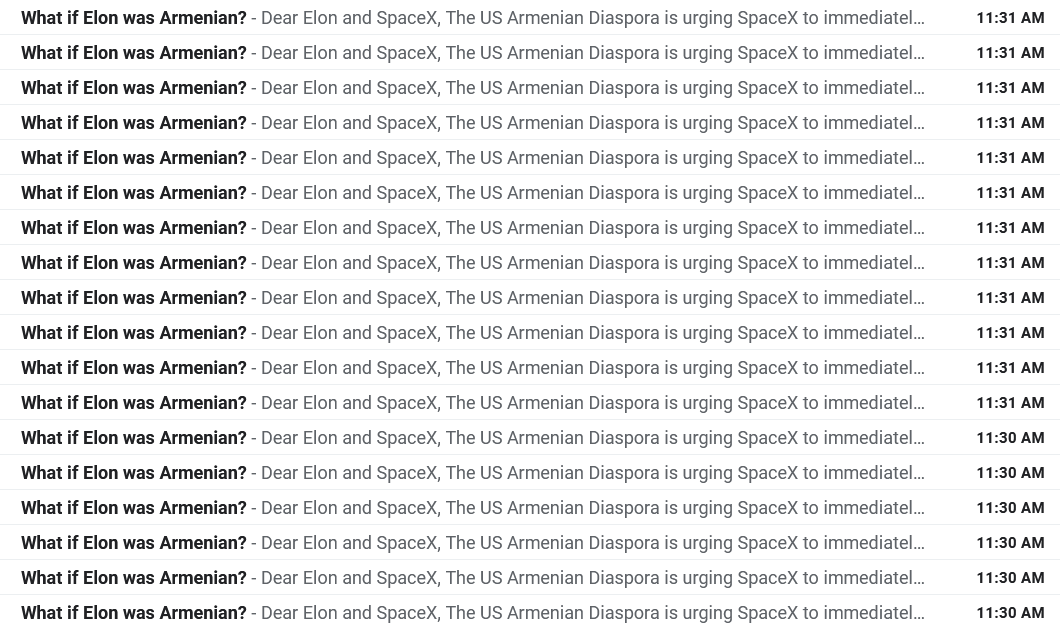 SpaceX staff and members of the media have been inundated this morning with emails ostensibly from concerned Armenians around the world, asking the company to cancel a launch contract with the Turkish government. The concerns are valid — and the mass-email method surprisingly effective.
