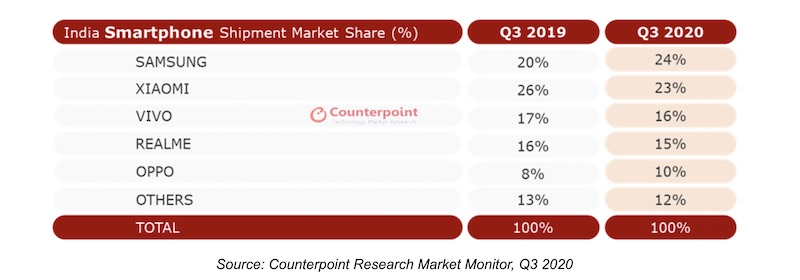 Counterpoint’s finding is in contrast to what research firm Canalys reported last week. According to Canalys, Xiaomi held the top spot in India with 26.1% of the market share in Q3 2020, ahead of Samsung’s 20.4%.