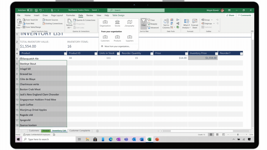 That means you can have a “customer” data type, for example, that can bring in rich customer data from a third-party service into Excel. The conduit for this is either Power BI, which now allows Excel to pull in any data you previously published there, or Microsoft’s Power Query feature in Excel that lets you connect to a wide variety of data sources, including common databases like SQL Server, MySQL and PostreSQL, as well as third-party services like Teradata and Facebook.