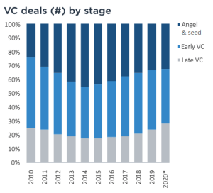 That decline in seed and angel dealmaking makes it not too surprising that, per the report, “93.4% of VC through Q3 2020 went to follow-on rounds,” measured in euros, not number of rounds. That leaves not a lot of money for startups just getting off the ground.