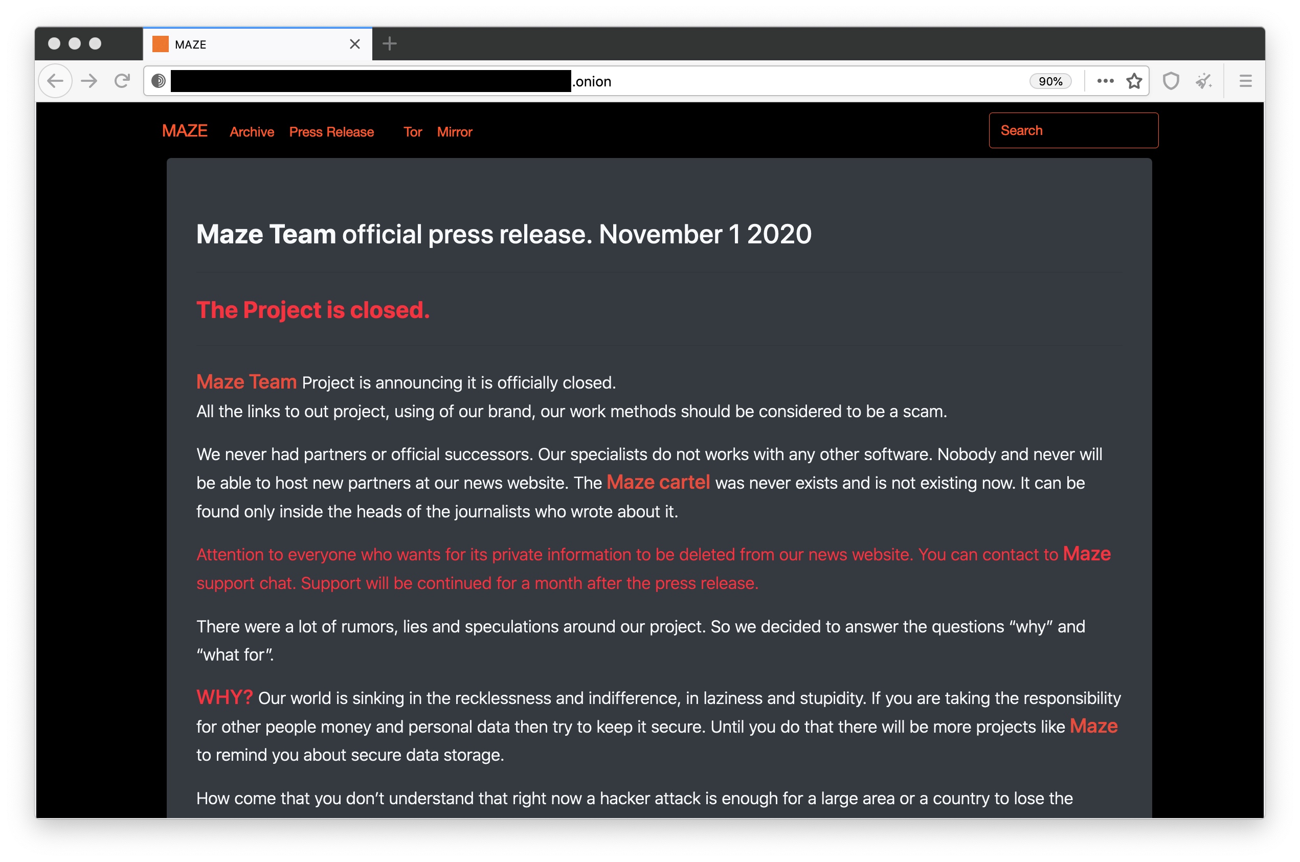 Callow said the group’s apparent disbanding leaves open questions about the Maze group’s connections and involvement with other groups. “As Maze was an affiliate operation, their partners in crime are unlikely to retire and will instead simply align themselves with another group,” he said.