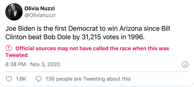 Other warnings popped up as some states were called early last night. After Fox News struck out alone in calling Arizona for Biden, some political reporters tweeting about those results had their tweets paired with a label stating that the race had not yet been called.