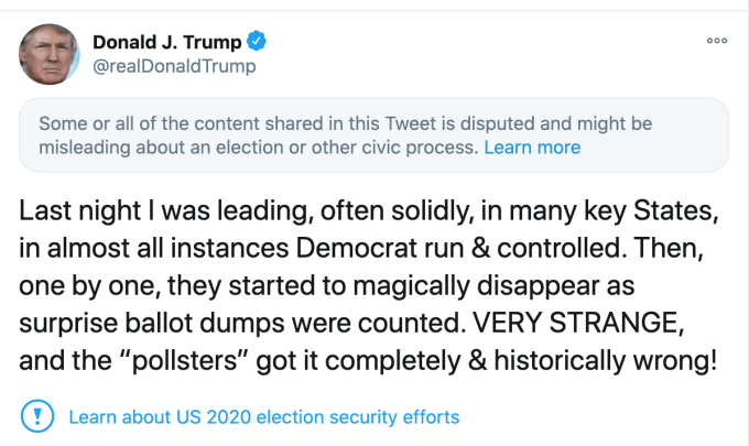 Update – 1:15 PM PT: Twitter attached a label telling users that votes are still being counted to a handful of tweets from users associated with Trump, including the campaign account @TeamTrump, Eric Trump and White House Press Secretary Kayleigh McEnany. Those tweets claim victory in Pennsylvania, a critical state for an electoral victory. With vote counting still underway, as expected, Pennsylvania has not been called for either candidate. On Twitter, the posts were not hidden or restricted like previous false election claims from Trump.