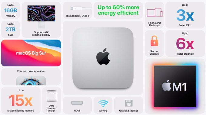 The Mac Mini is also getting overhauled for the M1, and its base price is dropping $100 down to $699. It’ll support up to 2TB SSD and up to 16GB of memory. Port-wise, it’s got two USB-A ports, two USB-C ports (with Thunderbolt/USB 4 support), a 3.5mm headphone jack, HDMI 2.0 and gigabit ethernet.