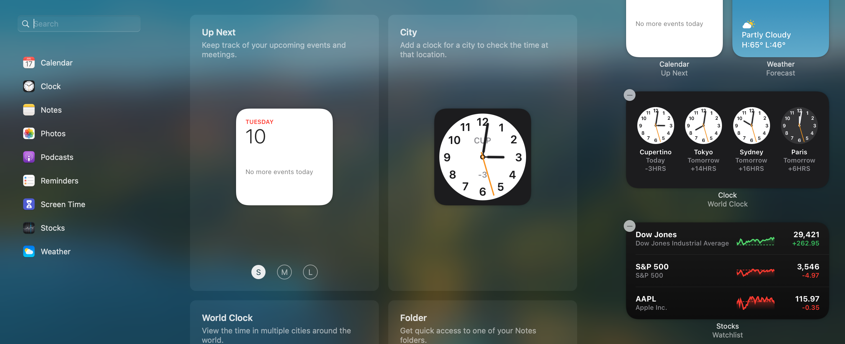 Now accessible by clicking the date and time in the menu bar (versus a devoted button), the two most appealing changes here are grouped notifications and widgets. Again borrowing from iOS, notifications are now stacked by group. Tapping the top of the pile will expand them down. You can “X” them out on the side to make them go away — but again, a swipe would be more satisfying. Also notable is the ability to interact with notifications. You can reply to messages or listen to podcasts straight from the river. It’s a nice addition for those who already use the feature as part of their workflow.