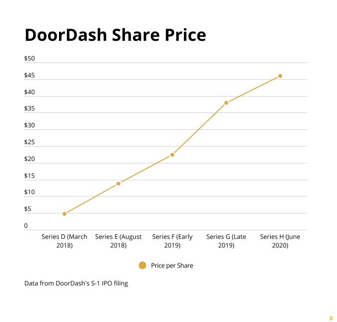 DoorDash’s most recent per share valuation was $45.91 for the Series H back in June. Shares purchased by investors over the entire life of the company had an average value of $8.73.
