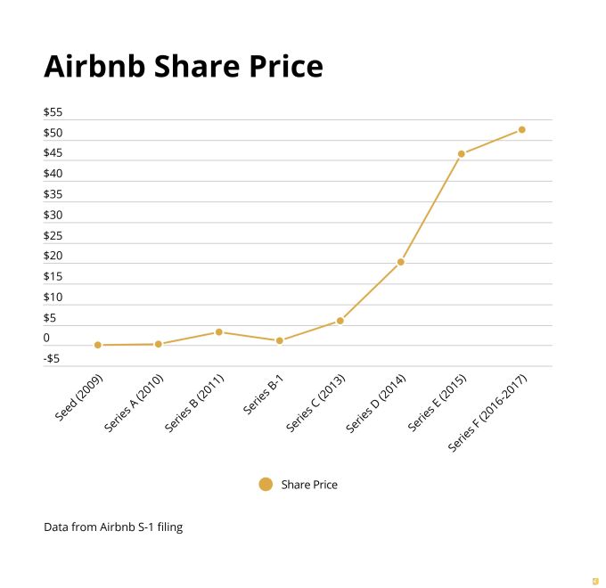 So, why do these VCs own such small stakes? The answer is mostly that Airbnb just became a hugely valued company very quickly in its life and these investors never got the kind of large stakes that come with the size of checks they were writing. Take a look at this chart showing Airbnb’s share prices over time:
