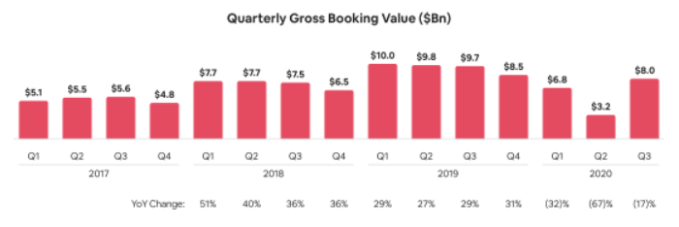 There are two ways to think about this. First, in quarterly terms, Airbnb has come back from just $3.2 billion in gross (which means net) bookings in Q2 2020, to $8 billion in Q3 2020. That’s a staggering return to form, even if Airbnb’s Q3 gross bookings were still off 17.5% from its year-ago Q3 total.