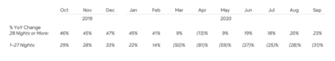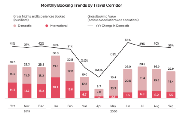 Starting in June, domestic travel started to grow on a year-over-year basis. It increased 21% in June, 17% in July, 16% in August and 14% in September. So while cross-border travel fell sharply (the red bits in the bar chart), more folks started to rent Airbnbs inside their home country.