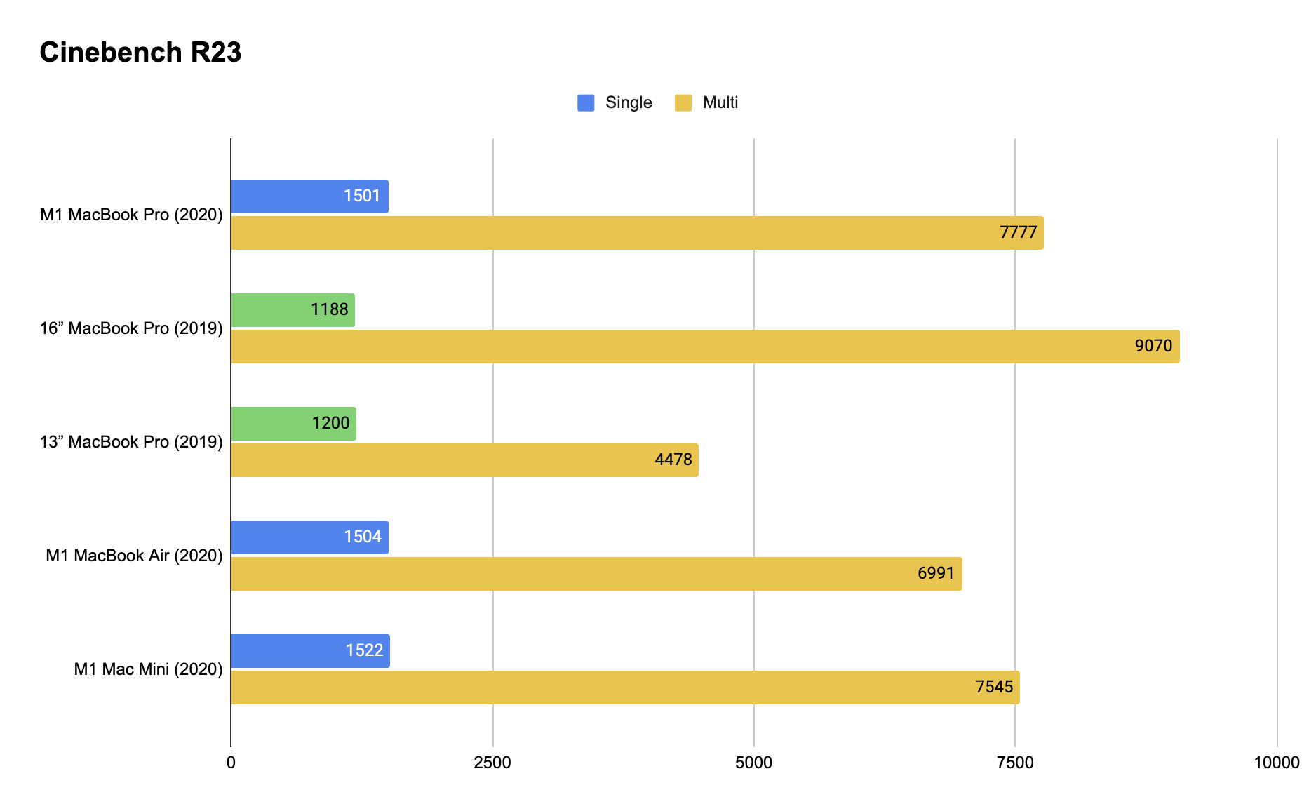 In that Cinebench test you can see that it doubles the multi-core performance of last year’s 13” MacBook and even beats out the single-core performance of the 16” MacBook Pro.