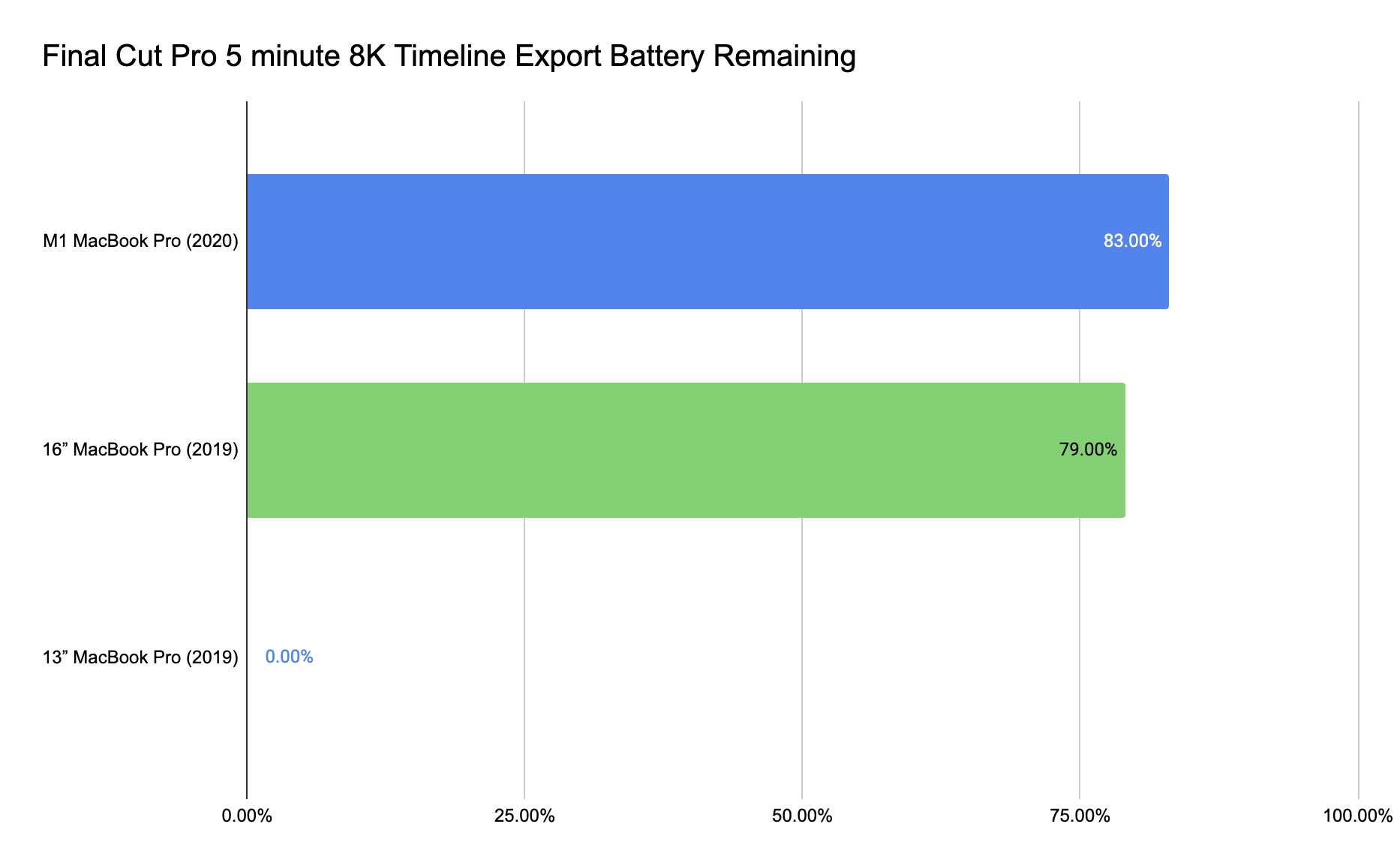 With an 8K timeline of the same duration, the 16” MacBook Pro with its Radeon 5500M was able to really shine with FCP’s GPU acceleration. The M1 held its own though, showing 3x faster speeds than the 13” MacBook Pro with its integrated graphics.