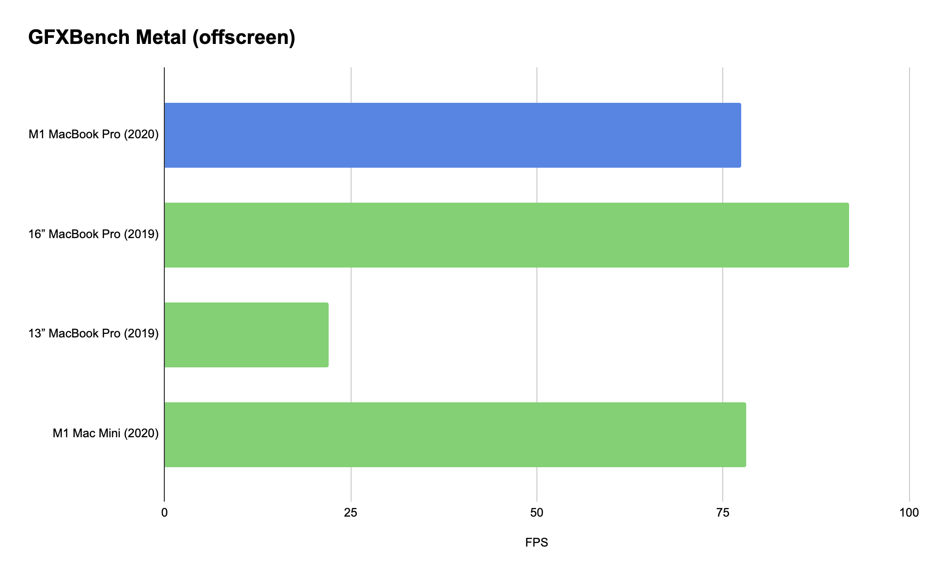As you can see in these GFXBench charts, while the M1 MacBook Pro isn’t a powerhouse gaming laptop we still got some very surprising and impressive results in tests of the GPU when a rack of Metal tests were run on it. The 16″ MBP still has more raw power, but rendering games at retina is still very possible here.