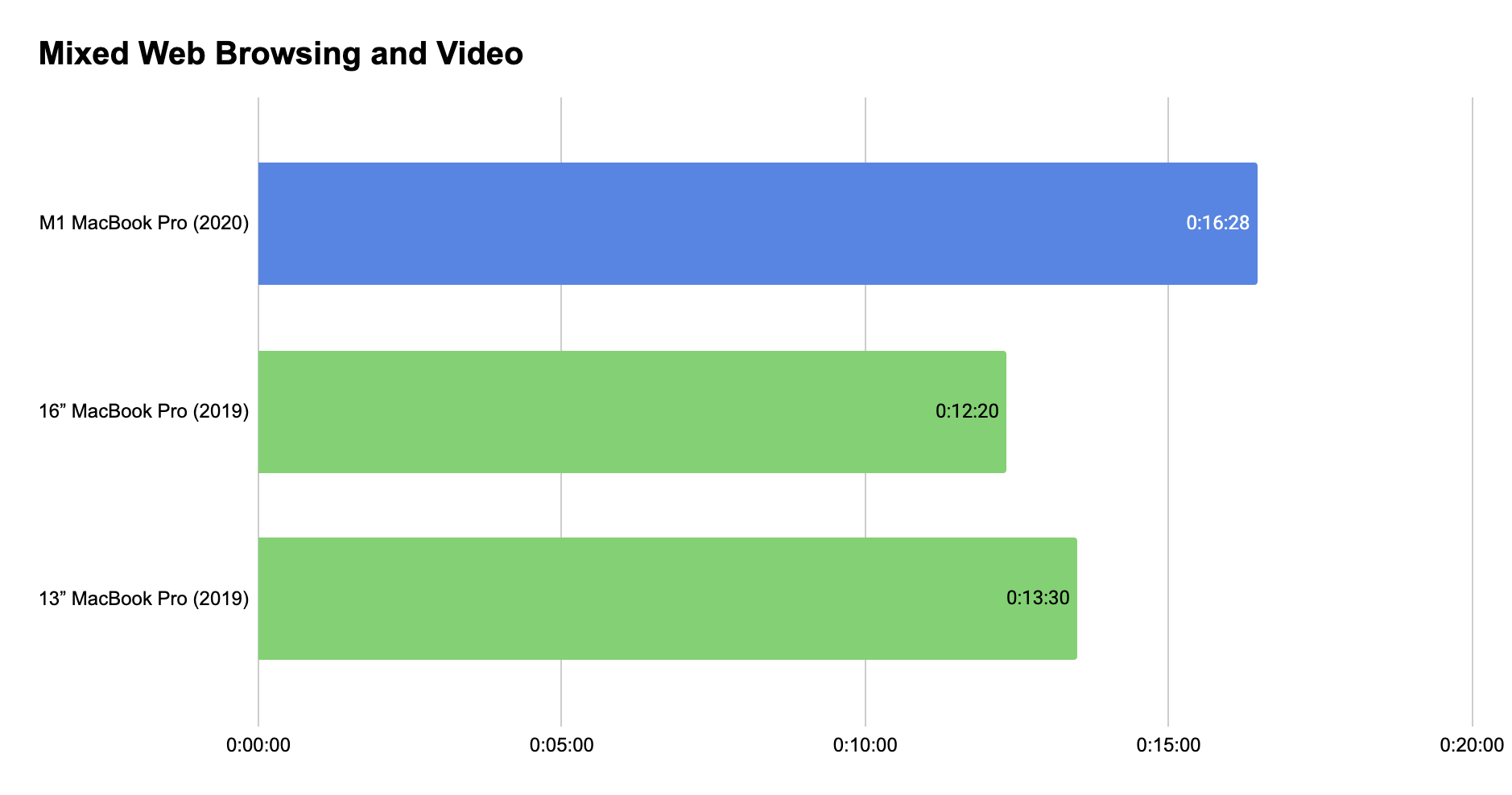 I ran a mixed web browsing and web video playback script that hit a series of pages, waited for 30 seconds and then moved on to simulate browsing. The M1 outperformed the other MacBooks by just over 25%. Those margins were far greater in our performance testing.