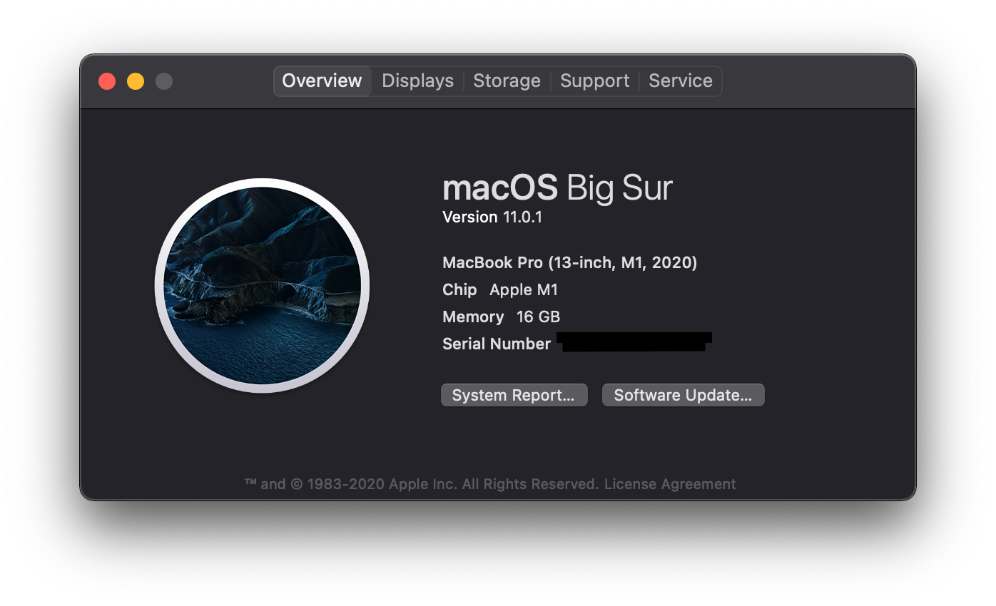 If you want an indicator of how Apple thinks about the tight connection loop between OS X Big Sur and the M1 processor, which it was built for and vice-versa, note that the M1 MacBook Pro’s about screen does not show clock speeds at all.