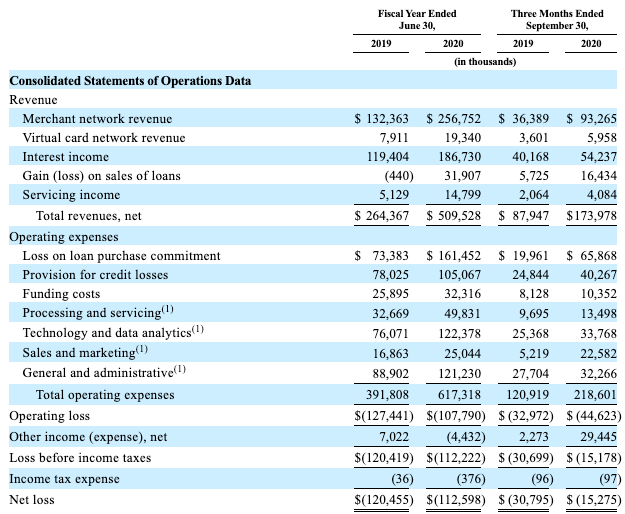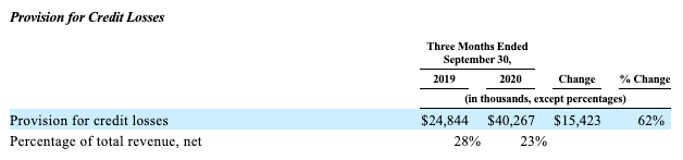 Here’s Affirm discussing its provision for credit losses in its most recent quarter (calendar Q3 2020) and the period’s year-ago analog (calendar Q3 2019):