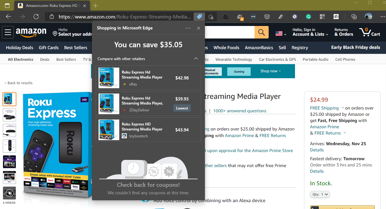At least in the Edge Canary, where this has been available for a little bit already, this was also hit and miss. It seems to work just fine when you shop on Amazon, for example, as long as there’s only one SKU of an item. If there are different colors, sizes or other options available, it doesn’t really seem to kick in, which is a bit frustrating.