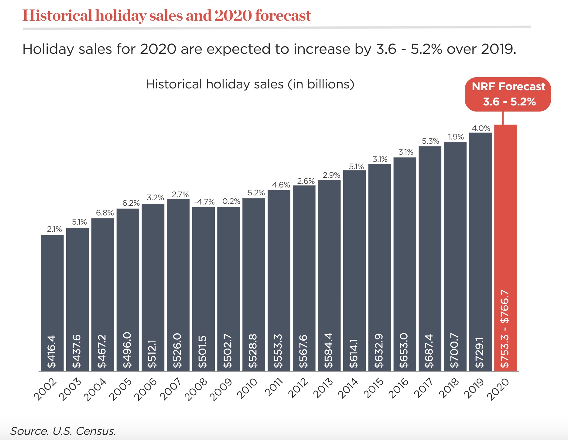 Of the two, NRF had the more optimistic forecast. It estimates U.S. holiday sales during November and December will increase between 3.6% and 5.2% year-over-year, for a total between $755.3 billion and $766.7 billion. That’s compared with a 4% increase in 2019 to $729.1 billion, and an average of a 3.5% increase over the past five years.
