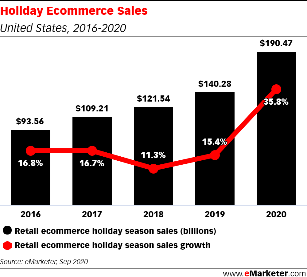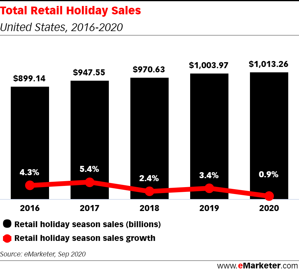 However, both agree on an e-commerce surge. NRF notes online sales were already up 36.7% year-over-year in the third quarter — in part, due to early holiday shopping. This year, some 42% of consumers had started shopping earlier than usual, it recently found. Plus, retail sales were up 10.6% in October 2020 versus October 2019, in aggregate, its forecast noted.